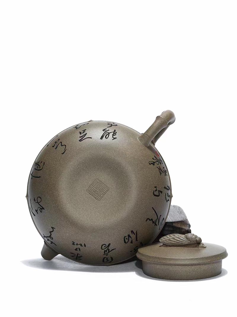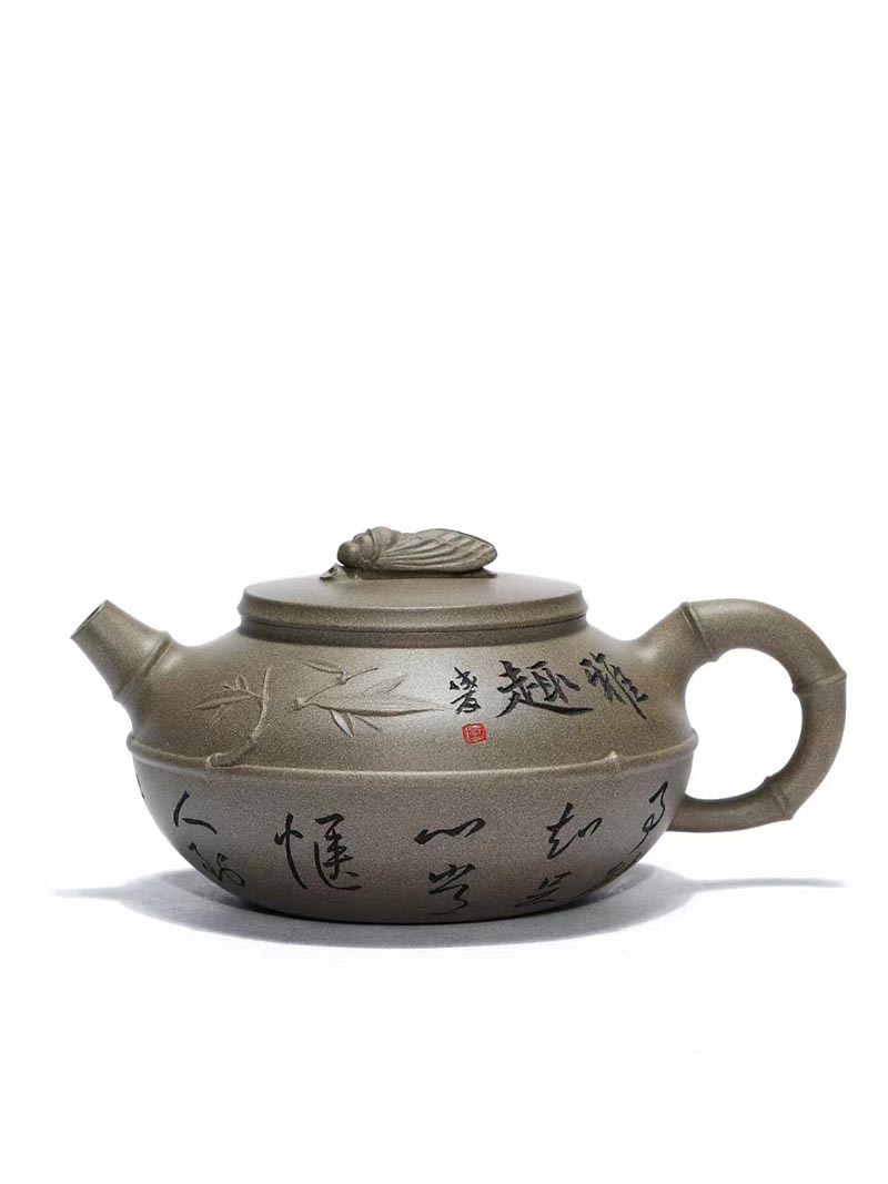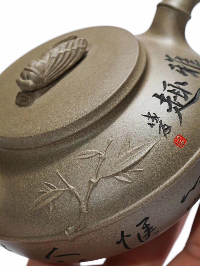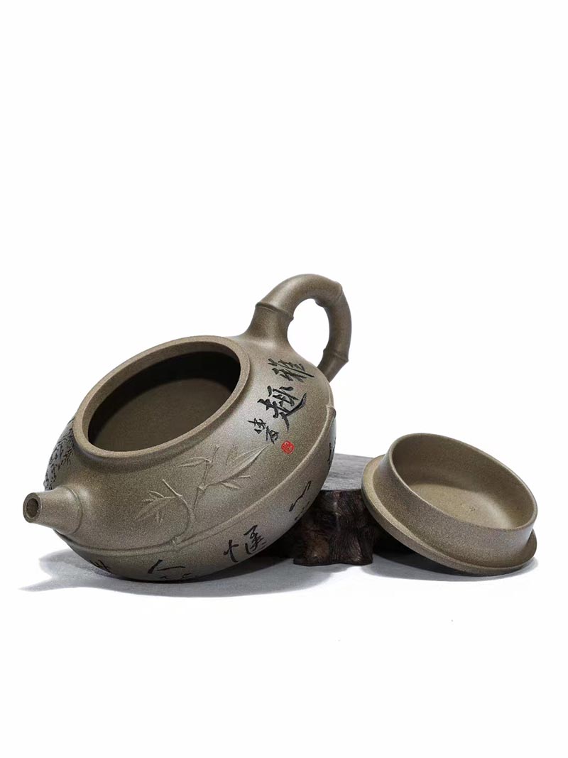 “大道不孤,众行致远!”传统紫砂壶创新《佛竹壶》,绿段泥,手工制作。铭文:事能知足心常惬,人到无求品自高,陈伯崖联句;图案:竹林悠闲图。容量:360cc。汪成友作品!