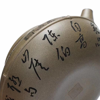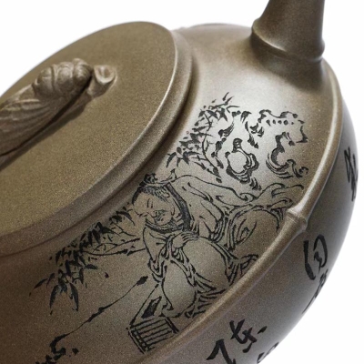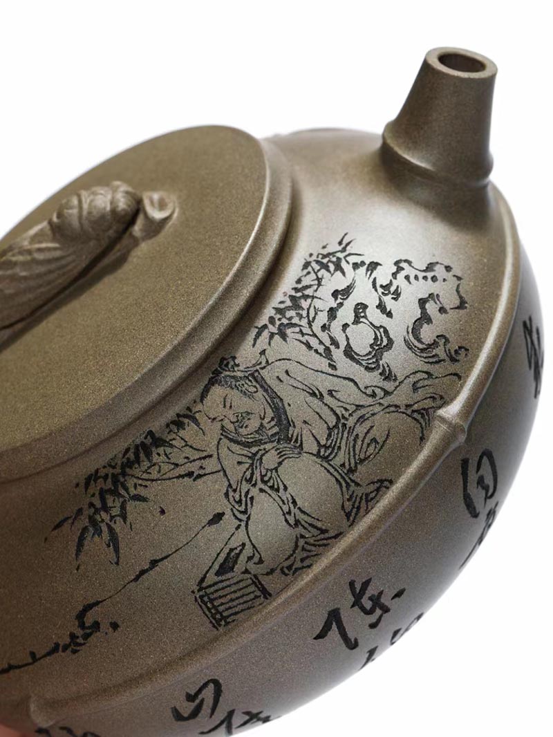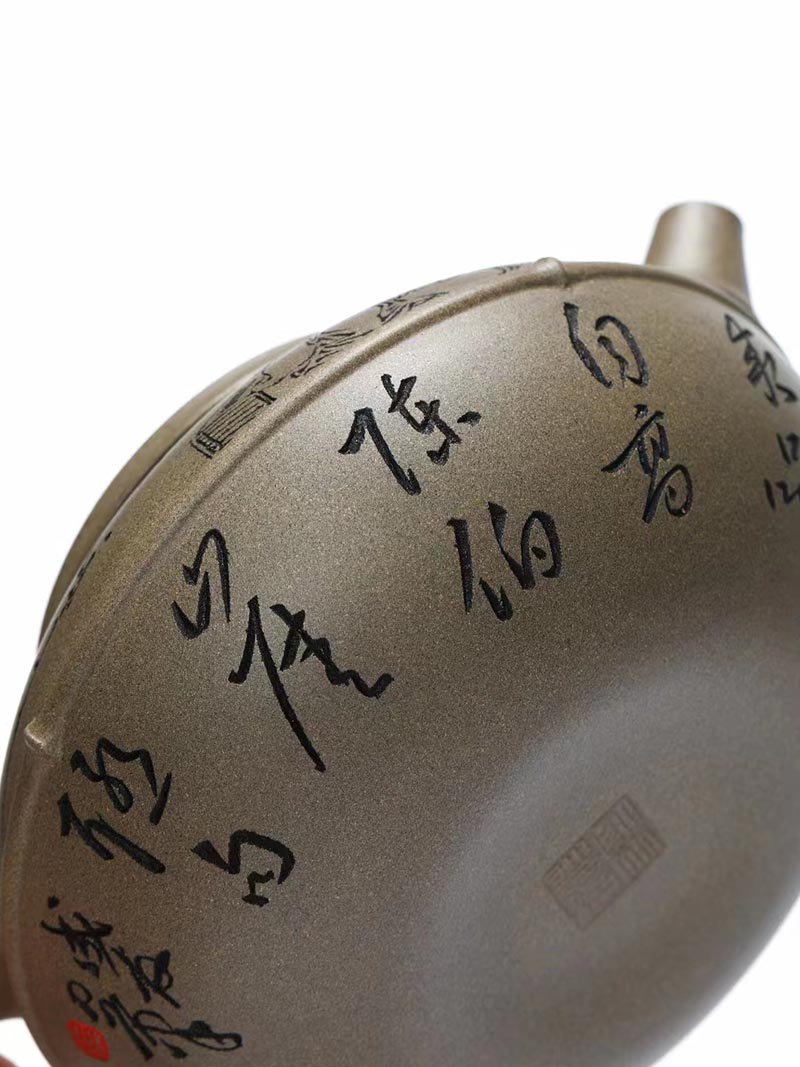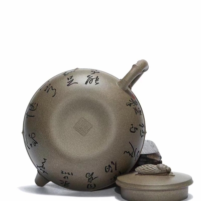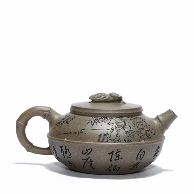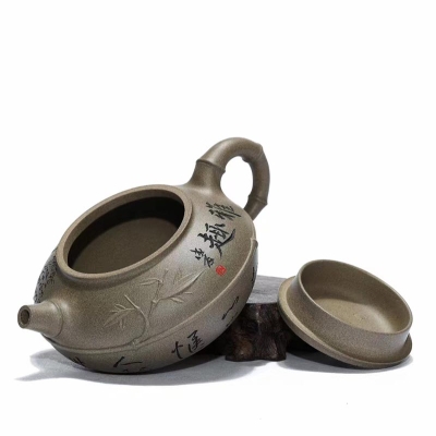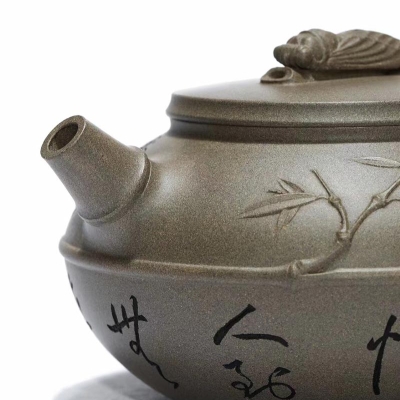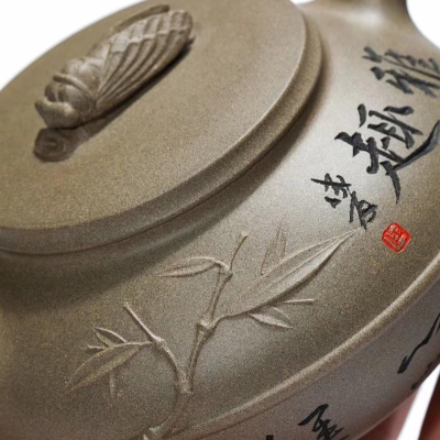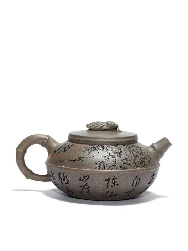 “大道不孤,众行致远!”传统紫砂壶创新《佛竹壶》,绿段泥,手工制作。铭文:事能知足心常惬,人到无求品自高,陈伯崖联句;图案:竹林悠闲图。容量:360cc。汪成友作品!