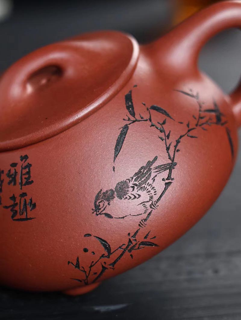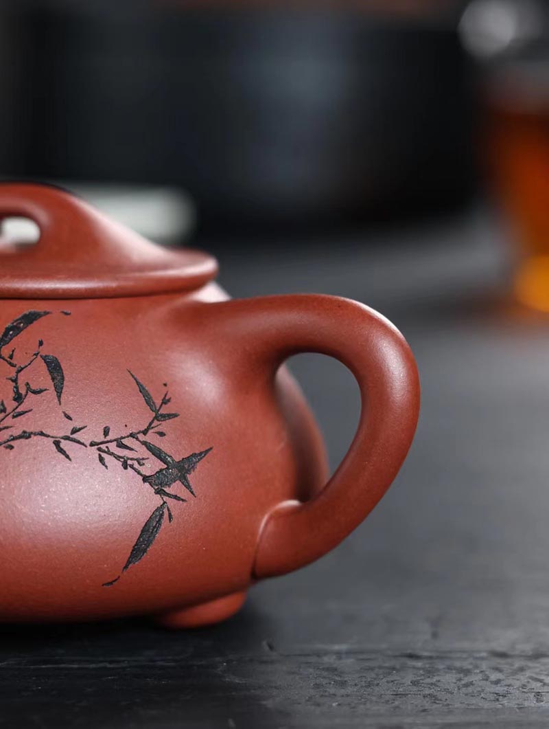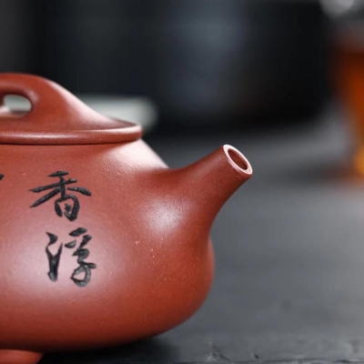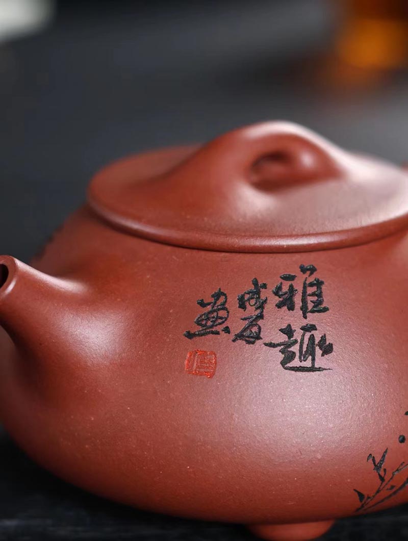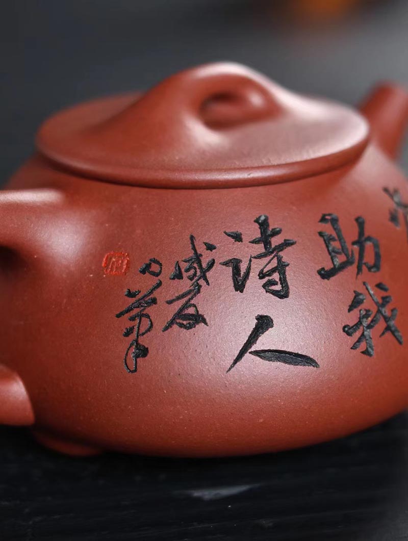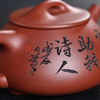 “培根铸魂,守正创新!”传统紫砂作品《石瓢壶》,清水泥,手工制作。铭文:香浮雀舌,助我诗人;图案:竹林雅趣图。容量:170cc。汪成友作品!