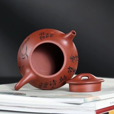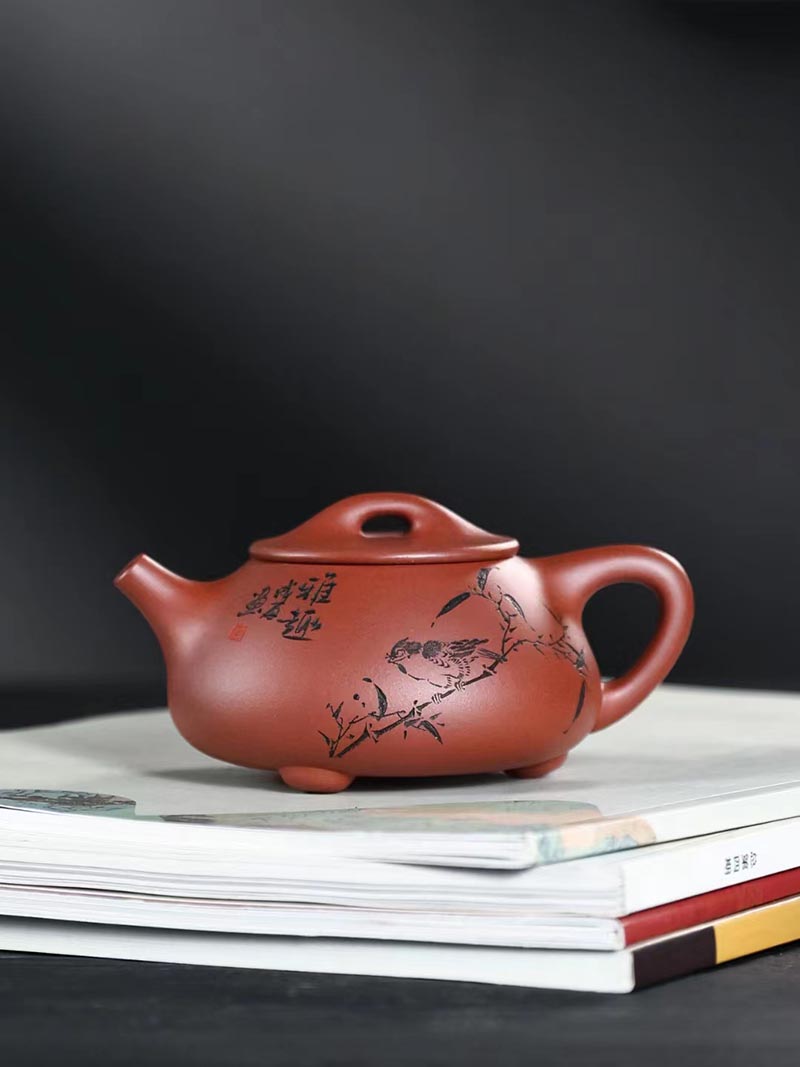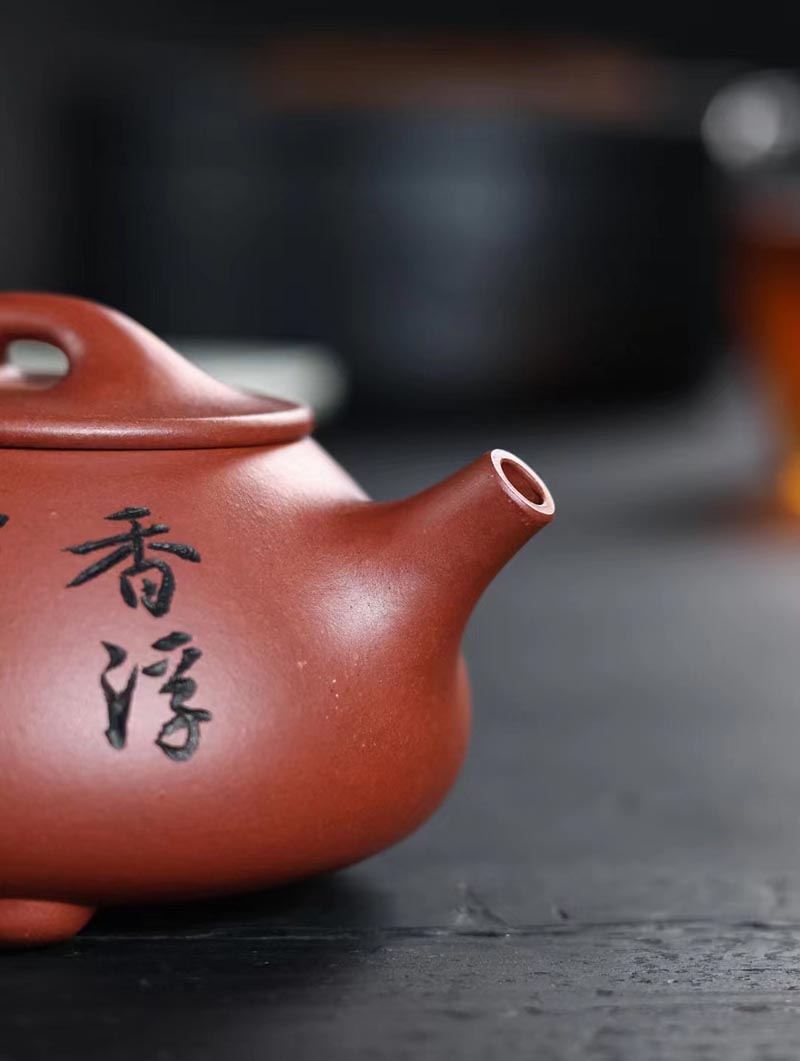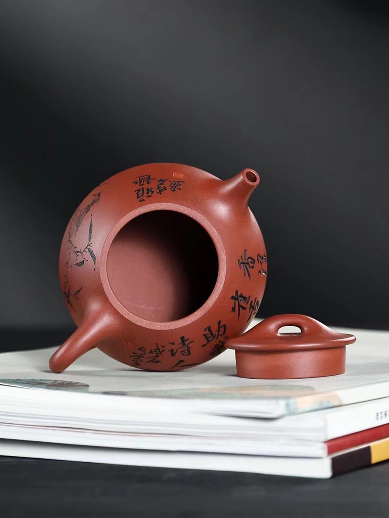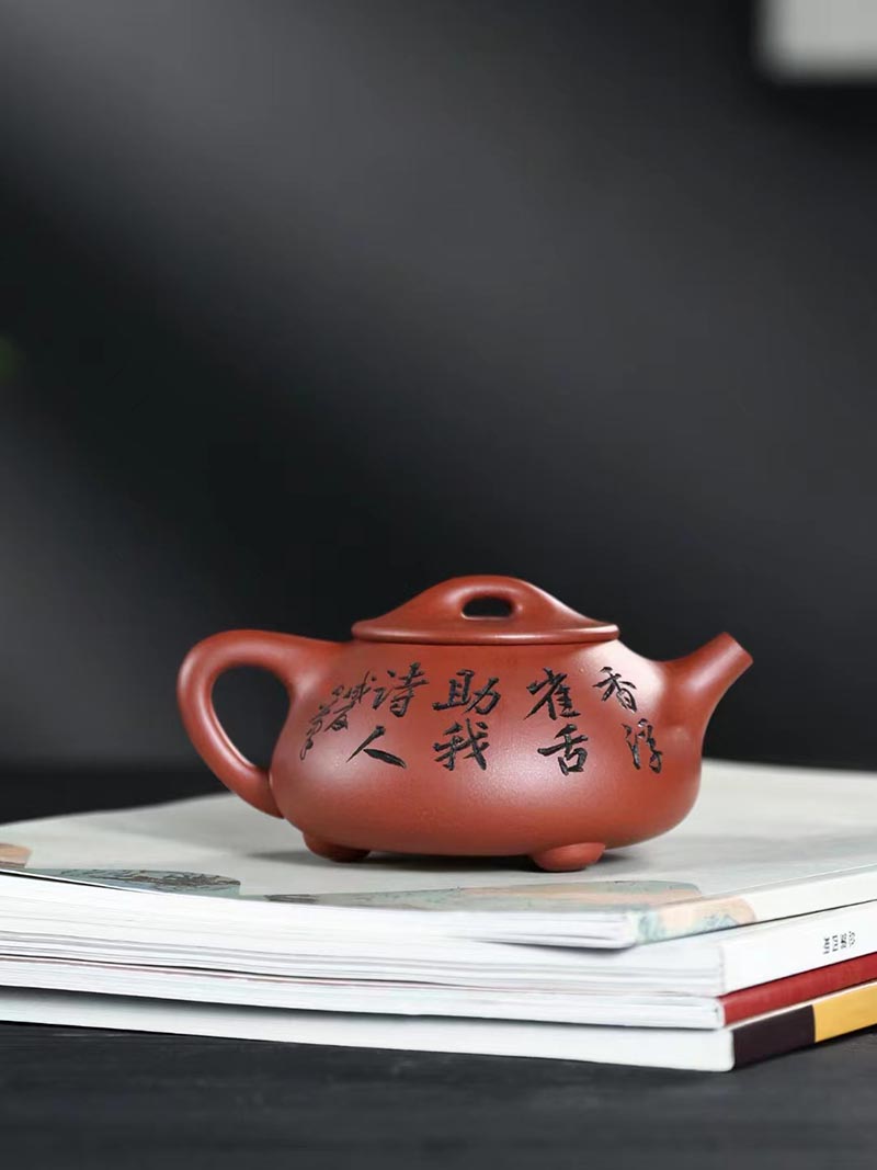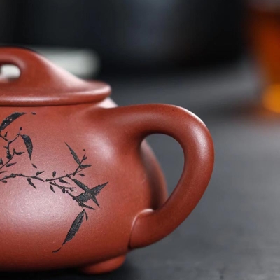 “培根铸魂,守正创新!”传统紫砂作品《石瓢壶》,清水泥,手工制作。铭文:香浮雀舌,助我诗人;图案:竹林雅趣图。容量:170cc。汪成友作品!