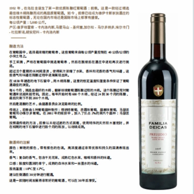 香气:复杂的香气,包含干无花果,成熟红色水果,咖啡和香料的味道。口感:酸度和圆润的单宁,成熟的森林水果和一丝墨水的味道。服务温度:10FC至12℃